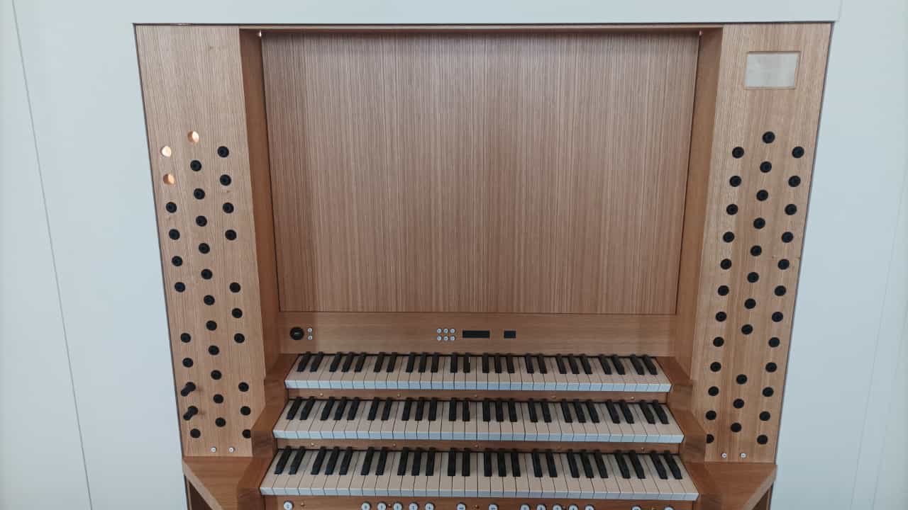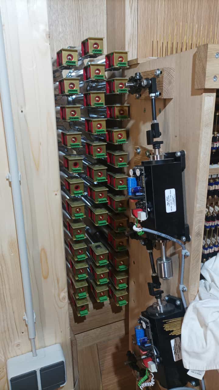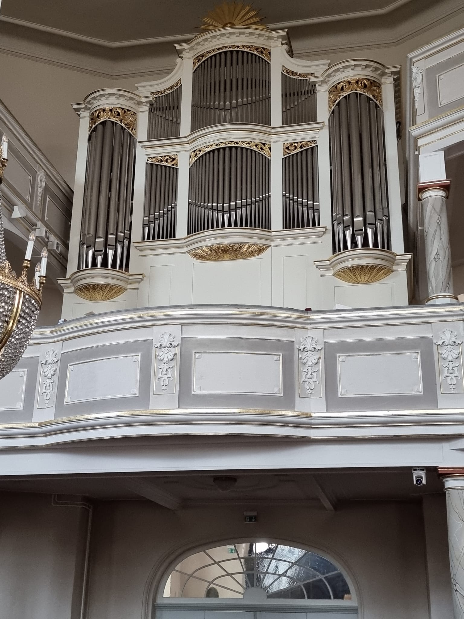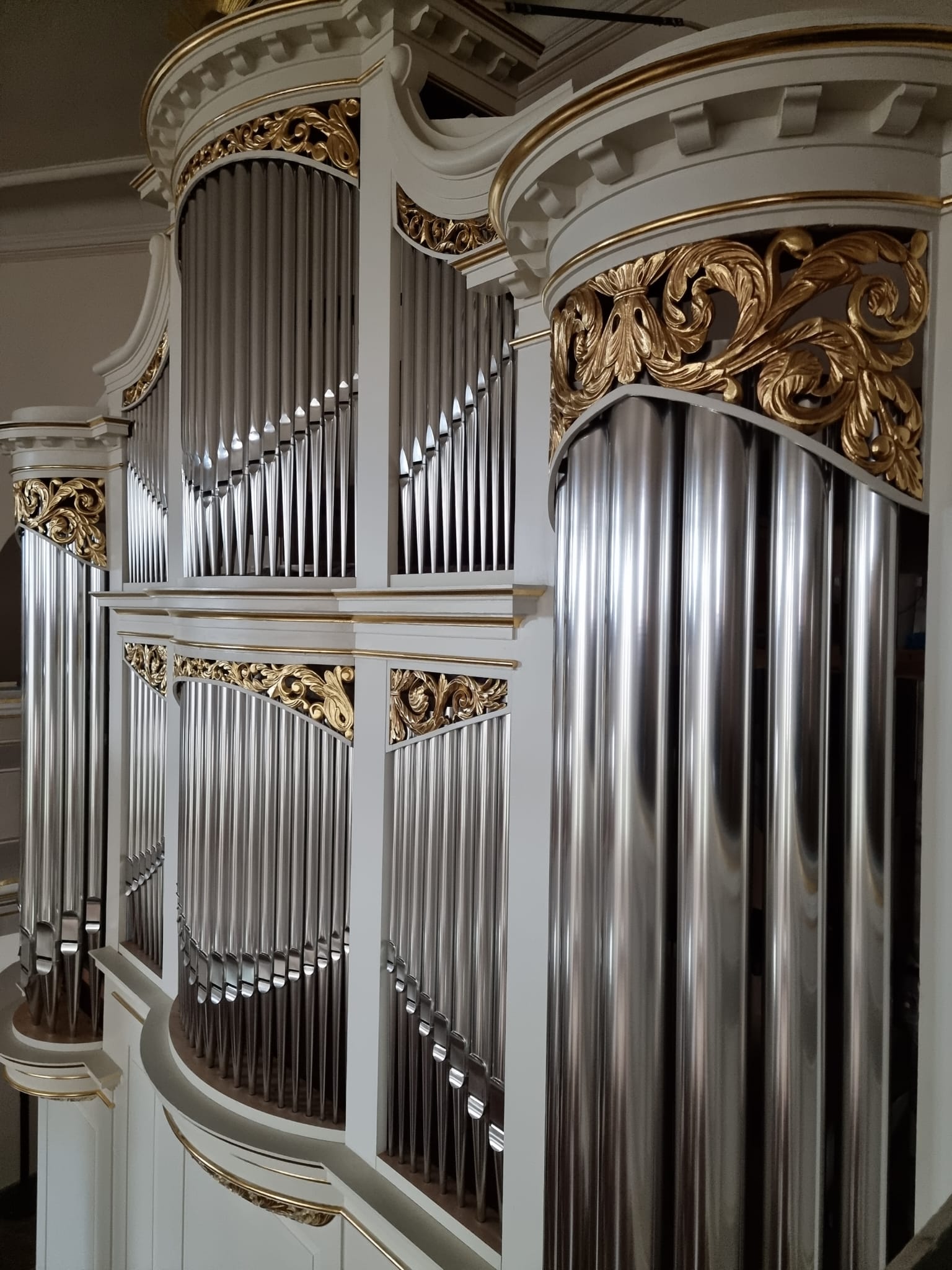 In der letzten Woche haben die Orgelbauer alle Pfeifen in der Prospekt-Front eingebaut, ausgerichtet und von der Schutzfolie befreit: Der Prospekt ist fertig und der Spieltisch fest eingebaut. Am letzten Märztag wurden an den Spieltisch die seitlichen Registerzüge montiert und unten die Fußtritte für die Setzeranlage verschraubt. Das elektronische "Gehirn" für die Registerschaltung der Orgel ist im Inneren montiert. Neben den Orgelbauern waren einige Tage die Elektriker tätig: Die Setzeranlage ist nun an Strom angeschlossen, der Gebläsemotor hat Energie und im Gehäuse der Orgel sind nun feste Steckdosen sowie feste Arbeitsleuchten in Betrieb. Die groben Montagearbeiten sind fast abgeschlossen. Nun geht es im April an die vielen "Feinheiten". Im Mai werden die fehlenden Pfeifen eingebracht und jede davon vor Ort passend klanglich abgestimmt. Ende Mai zu Pfingsten wird dann die Einweihung sein. Die Termine der Festlichkeiten sind unter "Veranstaltungen" zu sehen. Am Tag vor der Einweihung gibt es ein Dankeschön-Konzert für eingeladene Gäste. Möchten sie noch eine Einladung zu dieser "Vorpremiere" ? Mit Übernahme einer Pfeifenpatenschaft erhalten sie diese und bekommen ihre Pfeife exklusiv vorgestellt.