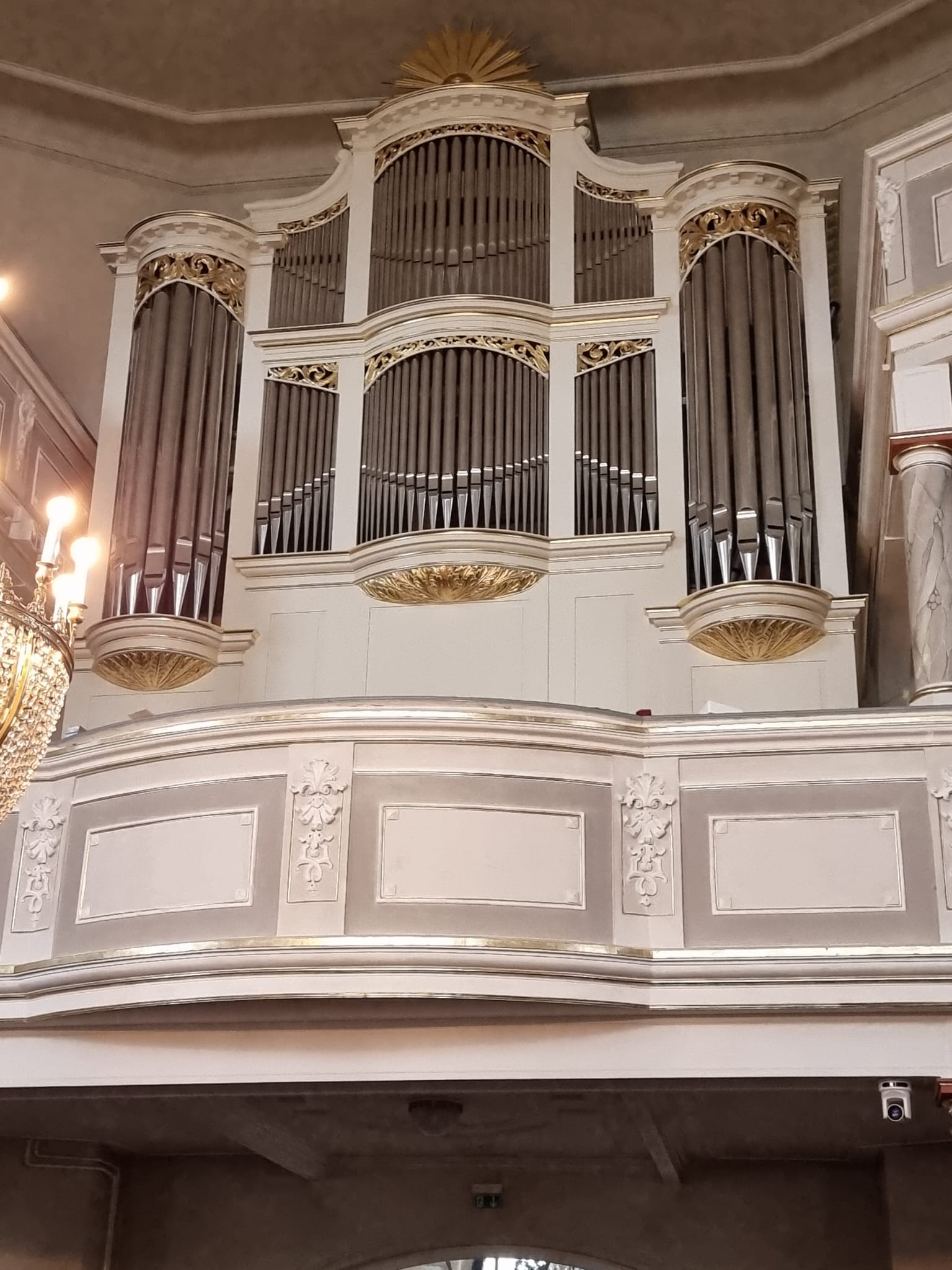 In der letzten Woche haben die Orgelbauer alle Pfeifen in der Prospekt-Front eingebaut, ausgerichtet und von der Schutzfolie befreit: Der Prospekt ist fertig und der Spieltisch fest eingebaut. Am letzten Märztag wurden an den Spieltisch die seitlichen Registerzüge montiert und unten die Fußtritte für die Setzeranlage verschraubt. Das elektronische "Gehirn" für die Registerschaltung der Orgel ist im Inneren montiert. Neben den Orgelbauern waren einige Tage die Elektriker tätig: Die Setzeranlage ist nun an Strom angeschlossen, der Gebläsemotor hat Energie und im Gehäuse der Orgel sind nun feste Steckdosen sowie feste Arbeitsleuchten in Betrieb. Die groben Montagearbeiten sind fast abgeschlossen. Nun geht es im April an die vielen "Feinheiten". Im Mai werden die fehlenden Pfeifen eingebracht und jede davon vor Ort passend klanglich abgestimmt. Ende Mai zu Pfingsten wird dann die Einweihung sein. Die Termine der Festlichkeiten sind unter "Veranstaltungen" zu sehen. Am Tag vor der Einweihung gibt es ein Dankeschön-Konzert für eingeladene Gäste. Möchten sie noch eine Einladung zu dieser "Vorpremiere" ? Mit Übernahme einer Pfeifenpatenschaft erhalten sie diese und bekommen ihre Pfeife exklusiv vorgestellt.